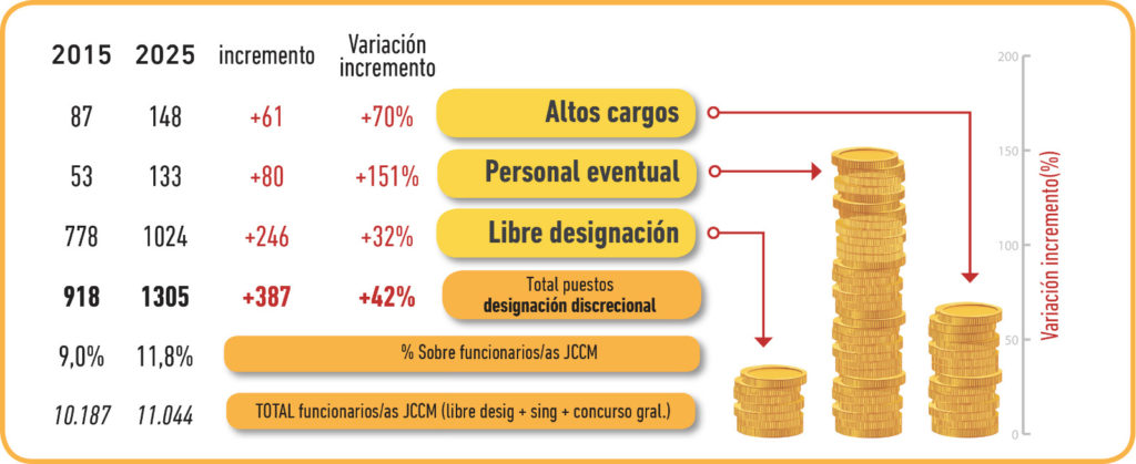 El fallo judicial deja en evidencia este modelo de gobierno en torno a la estructura pública, que ha reforzado su cúpula a costa de vaciar la base. Los altos cargos han pasado de 87 en 2015 a 148 en 2025, un aumento del 70%. El personal eventual ha crecido un 151%, y los puestos de libre designación, un 32%. Un ejército de cargos de confianza sin filtro ni transparencia, cobrando sueldos de hasta 50.000 euros mientras las residencias de mayores, oficinas de empleo y delegaciones provinciales están bajo mínimos de personal.
